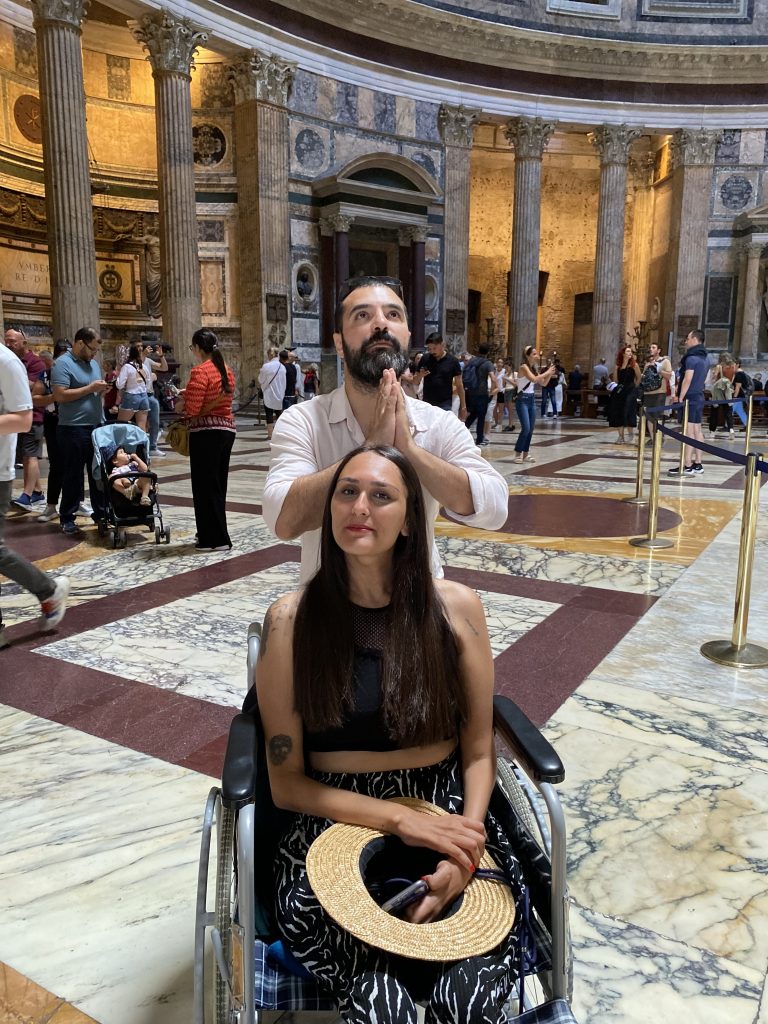 Tarihin kalbinde yer alan Pantheon, düz zeminli yapısıyla engelliler için Roma deneyimi içinde kolayca gezilebilen alanlardan biri. Girişte yine önden alınıyoruz hiç sıra beklemeden. Görevliler hemen bize kapıları açıyor.